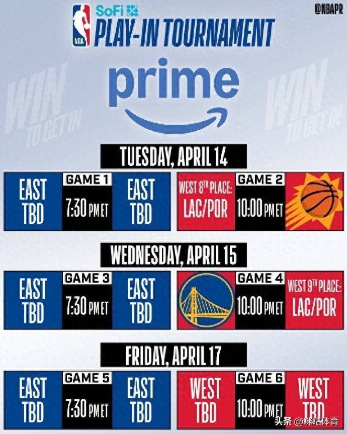 4月15日G1:7:30 东部第八 vs 东部第七G2:10:00 快船/开拓者 vs 太阳4月16日G3:7:30 东部第十 vs 东部第九G4:10:00 勇士 vs 快船/开拓者4月18日G5:7:30 G3胜者 vs G1败者G6:10:00 G4胜者 vs G2败者上咪咕视频看NBA,解锁更多精彩瞬间!AI黑科技、特殊视角等你解锁,关注赛场的每一处细节!